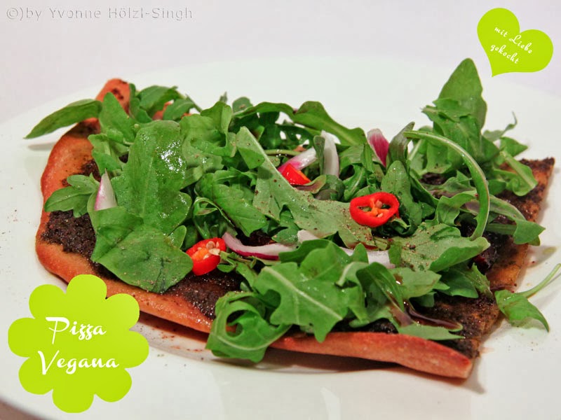 Am Foto seht Ihr eine vegane Variante mit Pesto (am besten schmeckt Bärlauch Pesto) statt Tomatensauce und nach dem Backen kommt leicht marinierter Ruccola drauf.