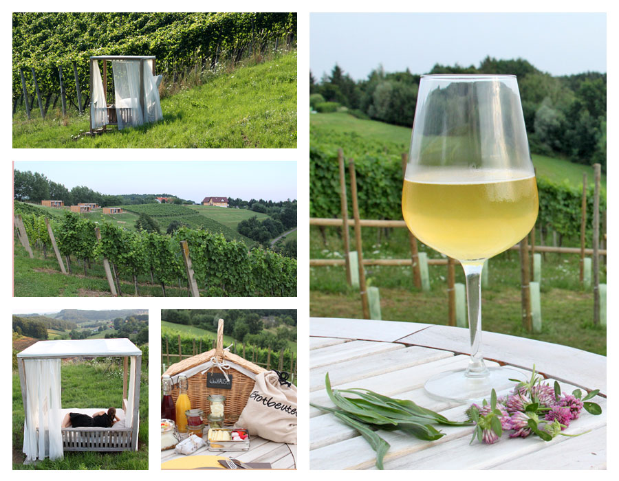 Ein absolutes Highlight ist auch das Himmelbett in der Blumenwiese, direkt neben den Weinstöcken mit traumhaftem Blick übers Tal…