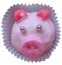 Mit Silberkugerl Augen machen, mit “Speck”-Erdbeeren Ohren schneiden und aus den “Speck”-Pilzen ovale Münder ausschneiden, mit einem Spieß zwei Nasenlöcher stechen und die Ohren und Mäuler in die leicht angetrocknete Glasur drücken.Trocknen lassen und in Papierschüsserl geben.