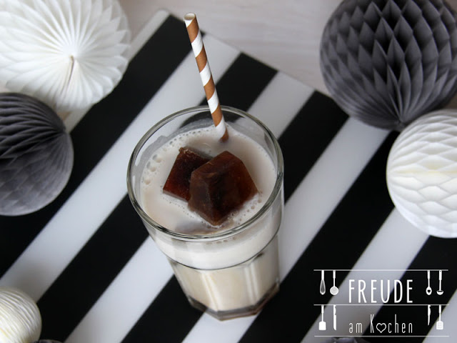 Die Eiswürfel in die selbetgemachte Mandelmlch geben und den eisigen Kaffee genießen.