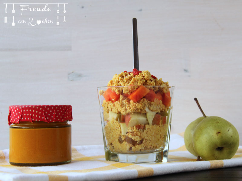 Am Schluß noch Trockenfrüchte und Nüsse unter die Pops rühren und mit den gewürfelten Früchten schichtweise servieren.