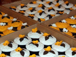 Für 83 Stück der Muffins in den schwarzen “Culpitt Baking Cases” hab ich 5 Teigportionen benötigt, Backzeit 40-45 Minuten jeweils (insgesamt hab ich 5,5 Std nur gebacken, aber auch weil ich immer nur 12 Stück – 1 Blech – auf einmal backen konnte) bei 160° C.