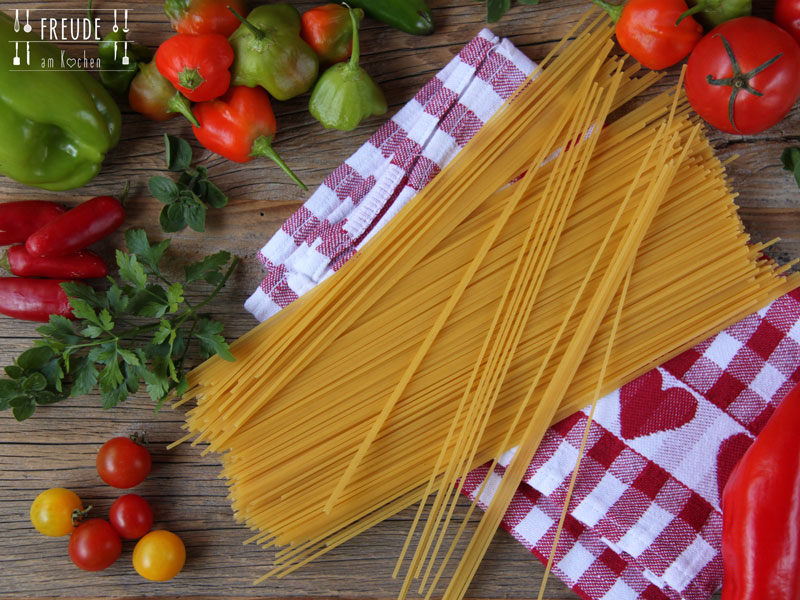 Lecker ist es auch, wenn man noch ein paar Ruccola Blätter grob zerschneidet und direkt vor dem Essen unter die Spaghetti mischt.